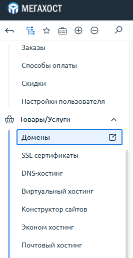 Чтобы сменить данные владельца, отображаемые в Whois необходимо перейти в пункт Товары/Услуги - Домены.