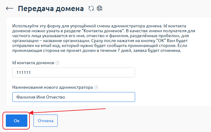 В поле ID необходимо вписать номер контакта который можете посмотреть в разделе Клиент - Контакты доменов а в поле Наименование вписать ФИО или название организации.