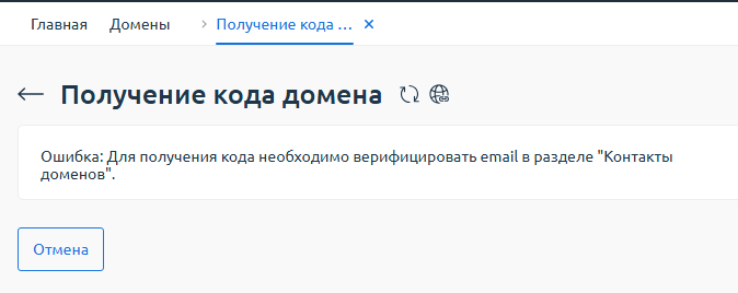 Если у Вас отобразилась Ошибка: Для получения кода необходимо верифицировать email в разделе "Контакты доменов", то Вам необходимо пройти верификацию текущего контакта